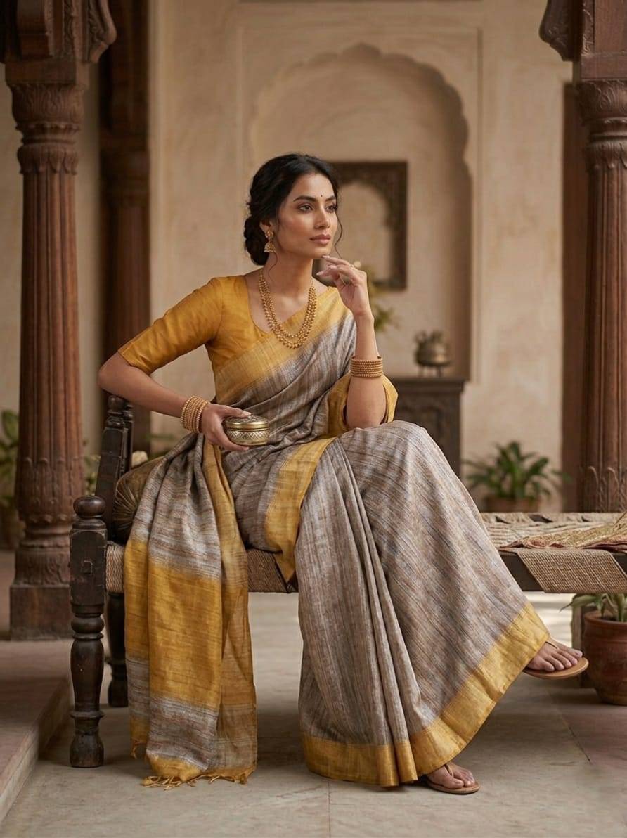Natural colour Gichcha Sari with Yellow pallu in mixed silk.