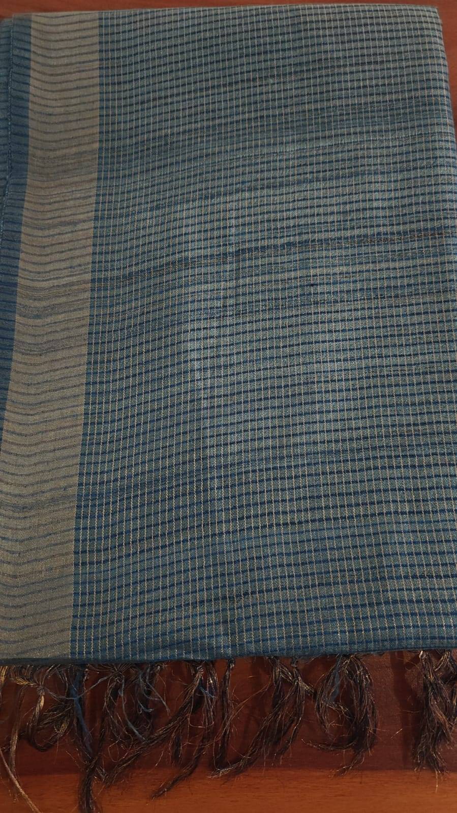 Checked Blue colour Tussar Sari with Gold Border