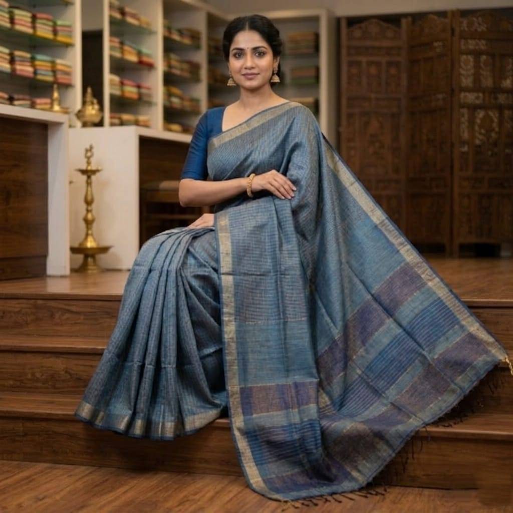A tussar silk saree should generally be dry-cleaned, especially for the first few washes, to preserve its natural luster and color. For at-home care, hand-wash gently with cold water and mild detergent. Always air-dry in the shade and iron on a low-heat setting with a protective cloth.