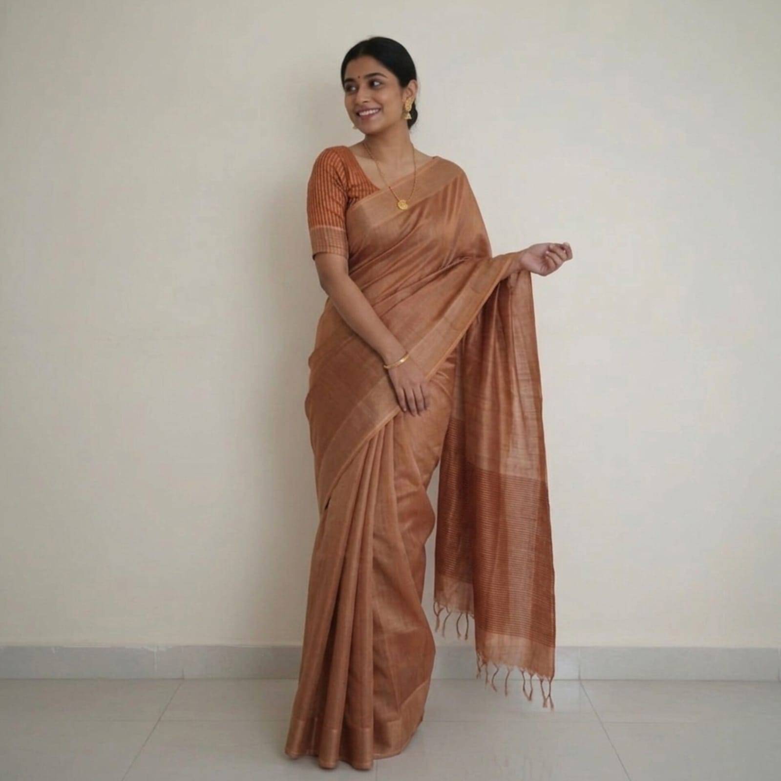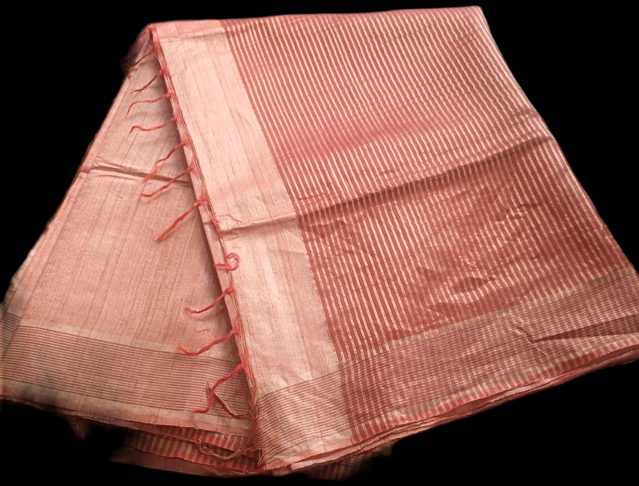 Pale brick colour Tussar Sari with Stripped pallu.