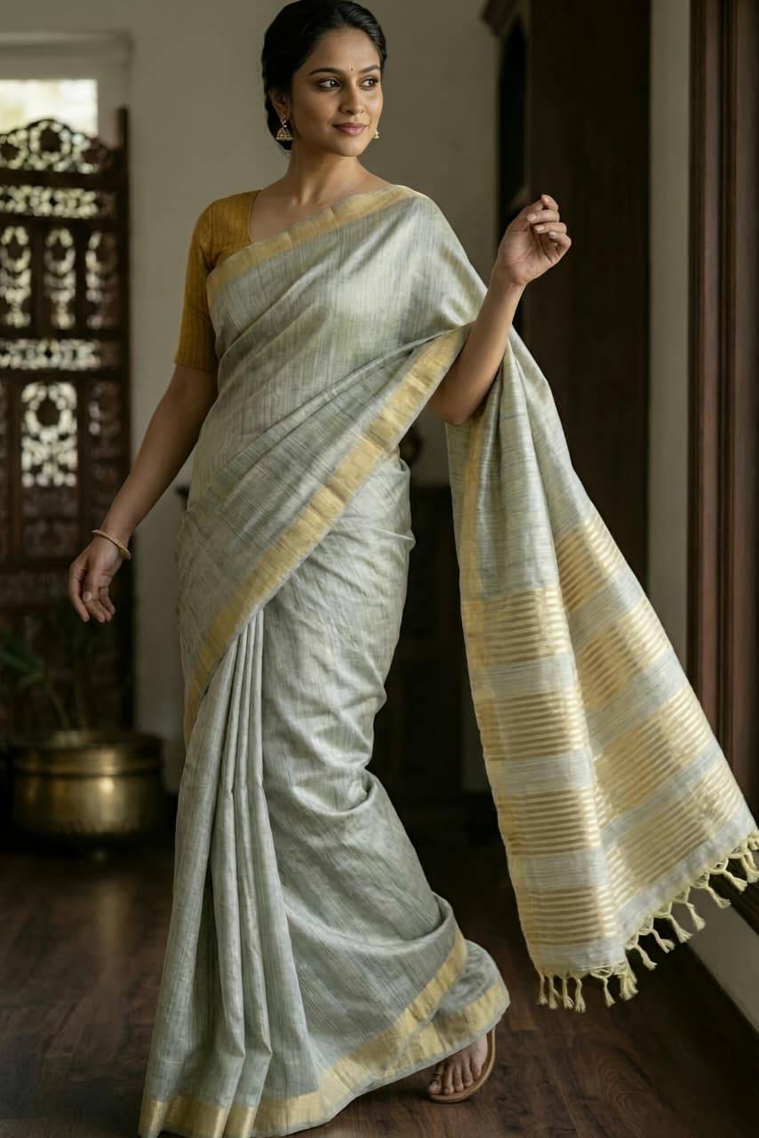 A tussar silk saree should generally be dry-cleaned, especially for the first few washes, to preserve its natural luster and color. For at-home care, hand-wash gently with cold water and mild detergent. Always air-dry in the shade and iron on a low-heat setting with a protective cloth.