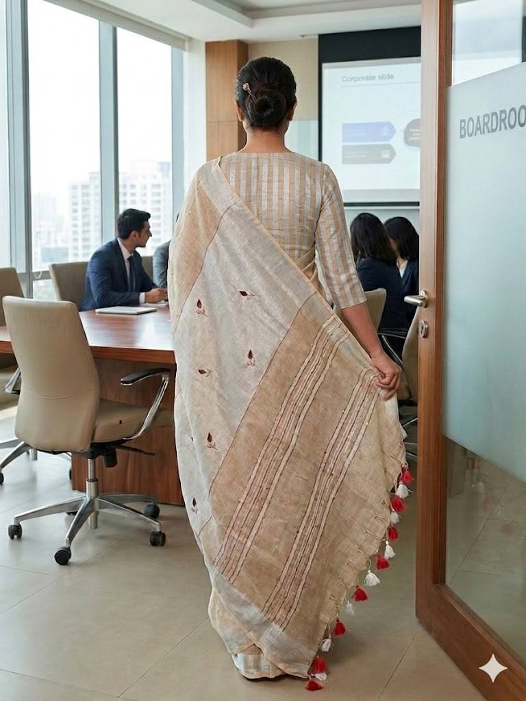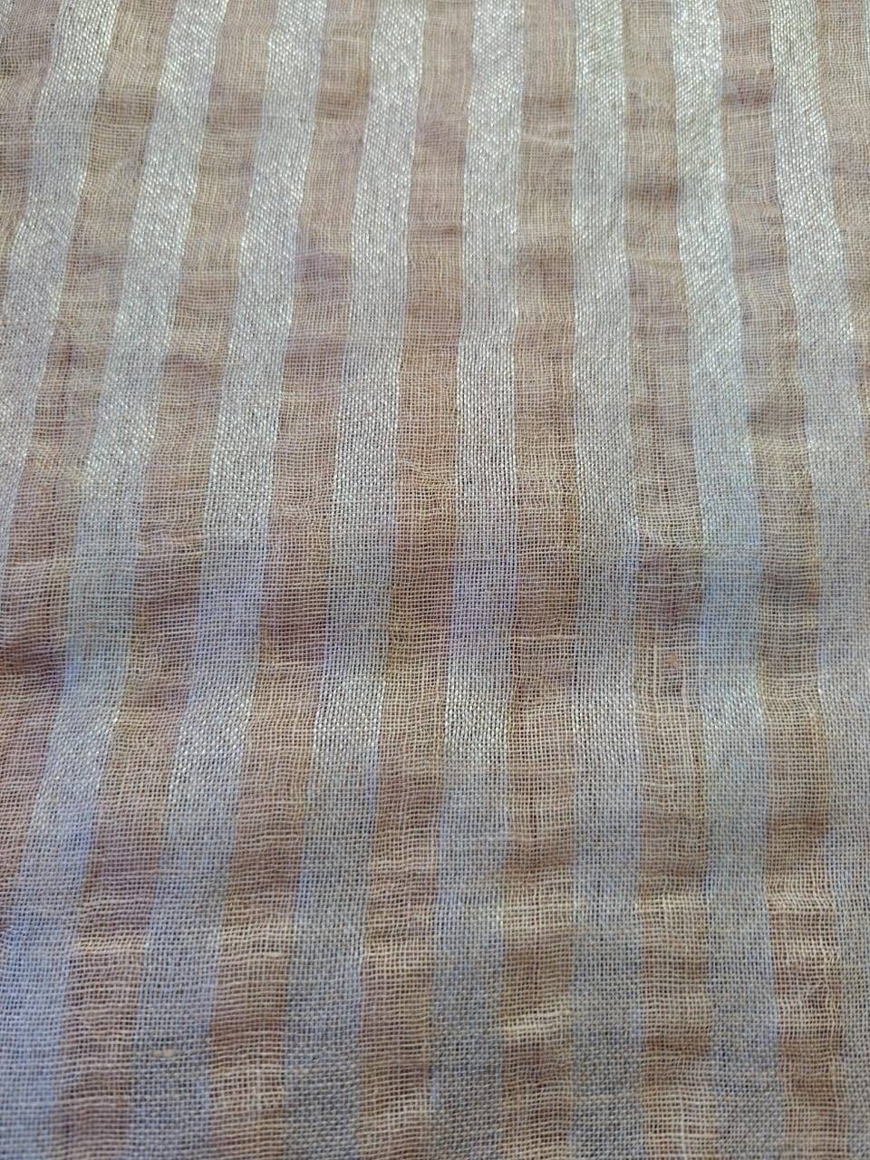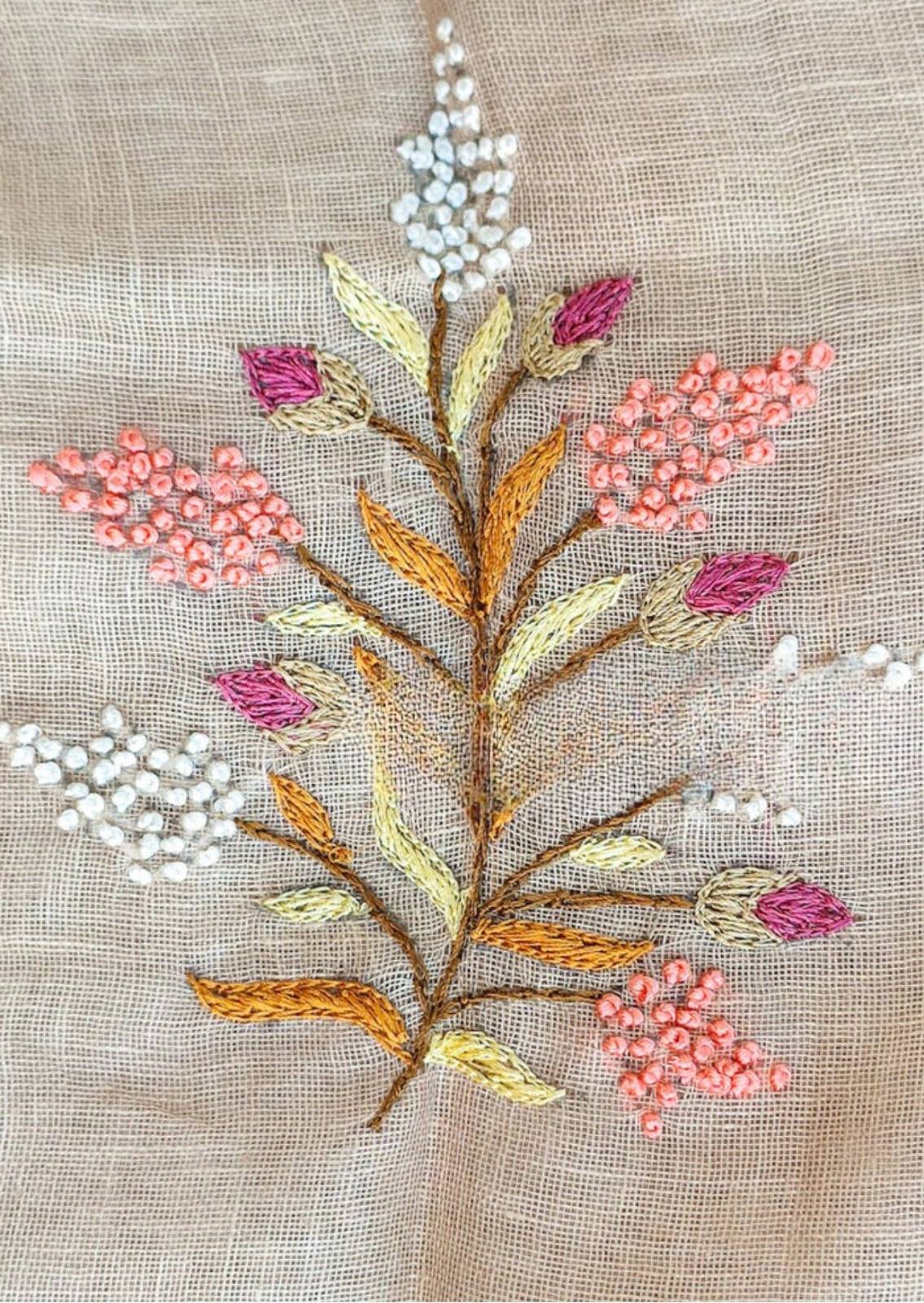 Beige Linen Saree with French Knot Embroidery and Stripped Blouse Piece