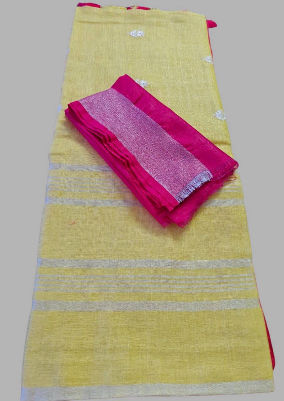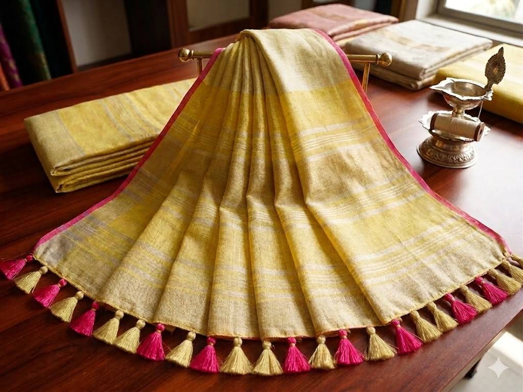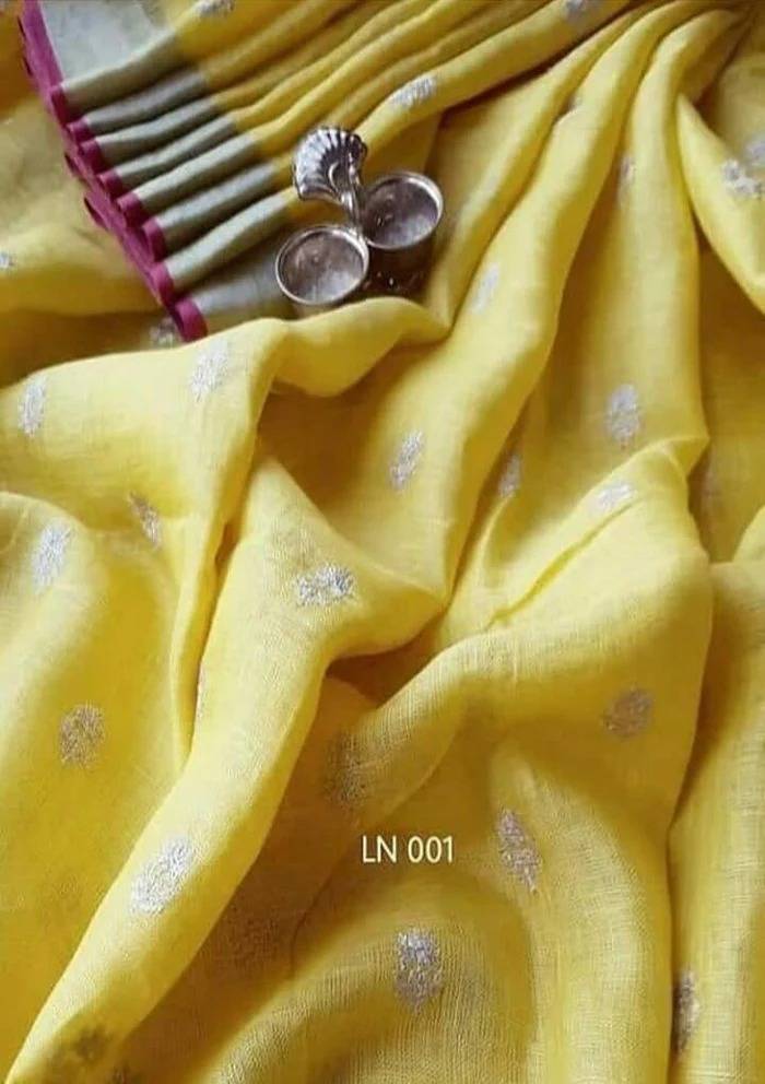 Pastel Yellow Linen Saree with Silver Embroidery