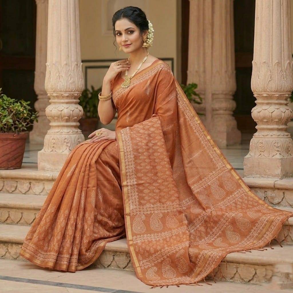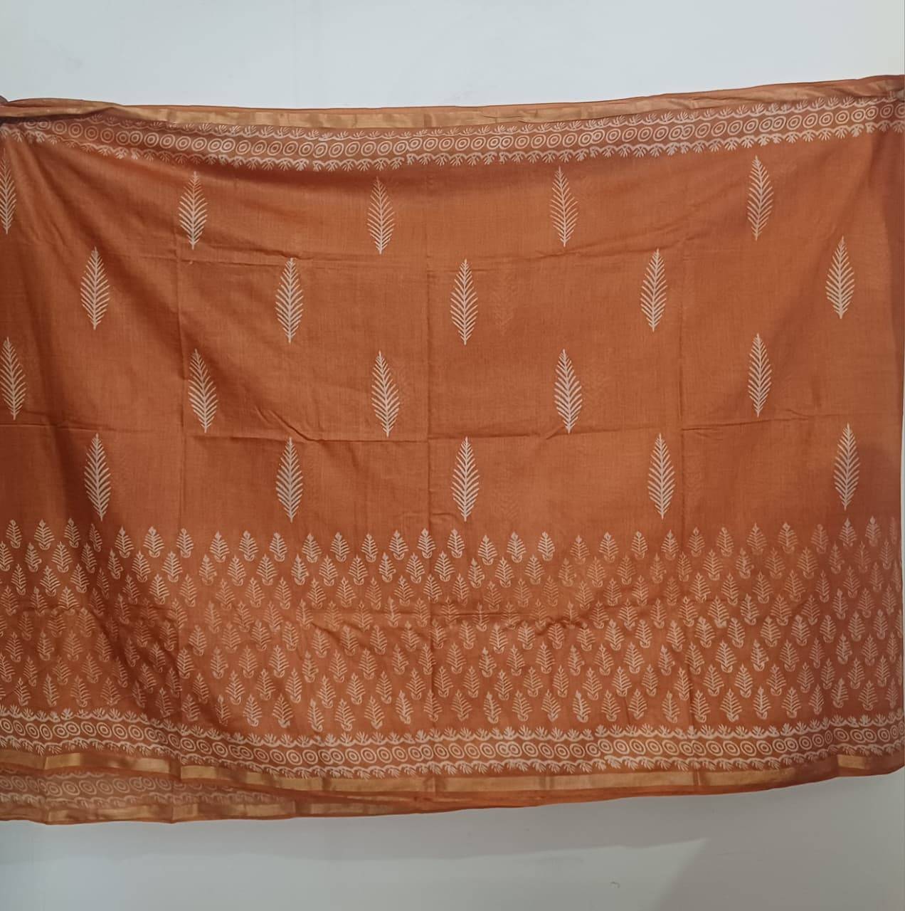 Matt Orange Hand Blocked Kora Cotton Saree
