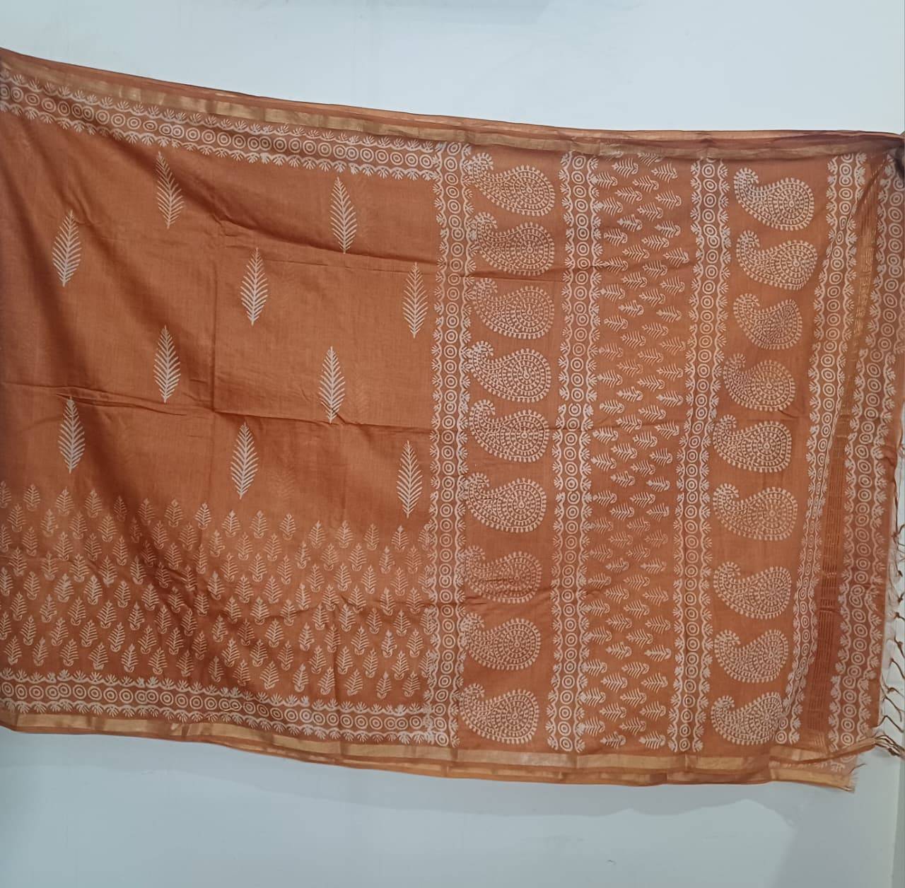 Matt orange hand blocked kora cotton saree