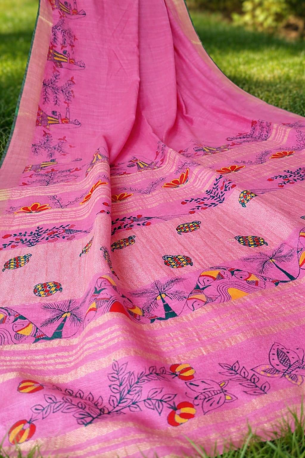 Pink linen sari with manjusha painted pallu.