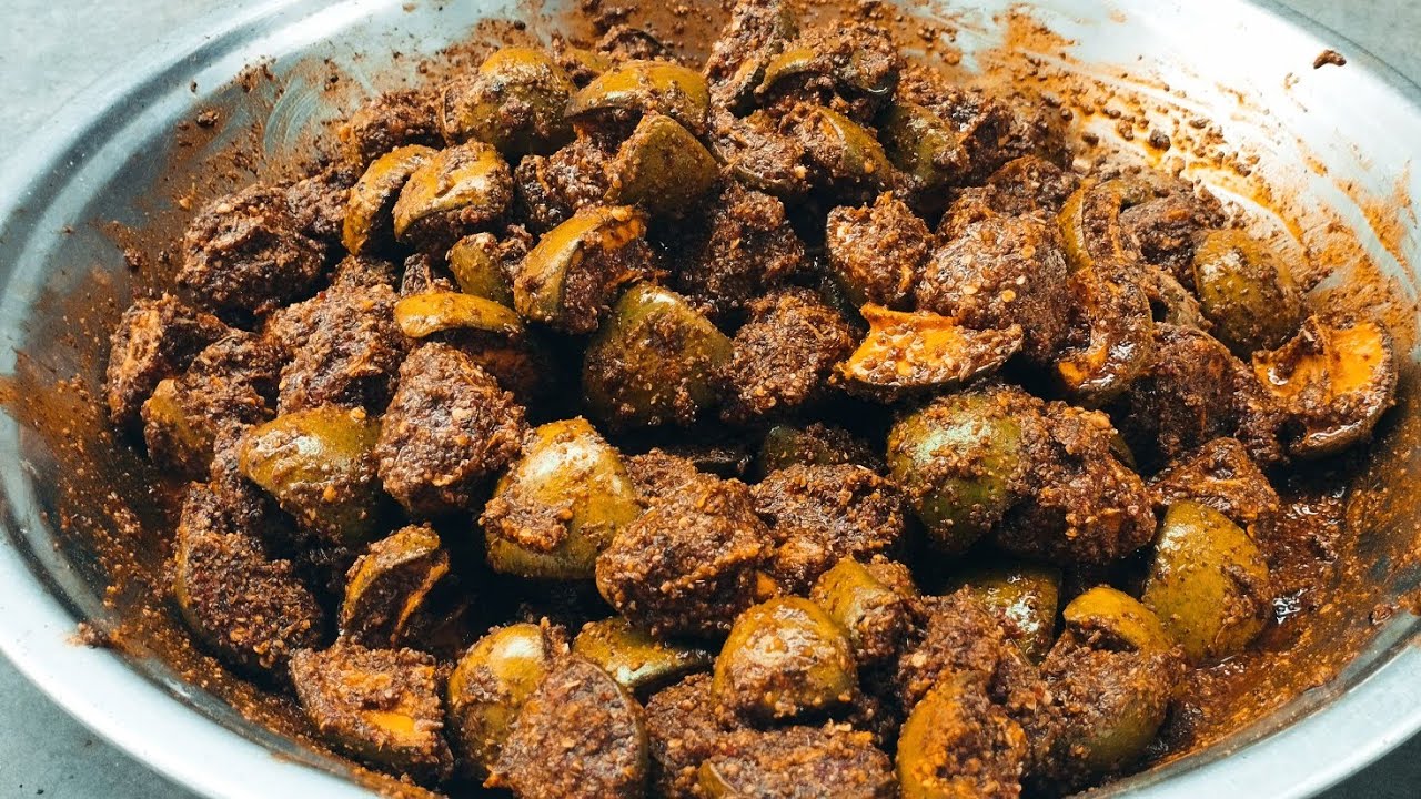 Aam Achar, or mango pickle, is a popular Indian condiment made from raw green mangoes, spices, and oil. It is typically prepared.